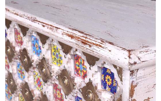 Arcón baúl oriental rustico colores. Baúl tapa abatible acabado rustico reciclado en decape colores, fabricada en madera de mango maciza con acabado en blanco decape rustico y incrustaciones decorativas en colores y metal, tirador aro metálico ENLACE TODA LA COLECCIÓN ALLEGRA