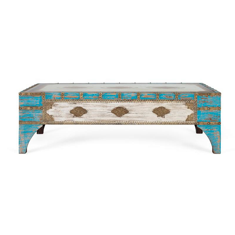 El Arte del Detalle Troquelado El verdadero carácter de estas piezas reside en sus laterales. Un intrincado trabajo de latón troquelado recorre el contorno de las mesas, aportando ese brillo exótico que recuerda a los palacios de Oriente. Este detalle metálico contrasta magistralmente con el acabado en azul y blanco envejecido, creando un efecto desgastado y vintage que encaja a la perfección en ambientes Shabby Chic, coloniales o eclécticos.