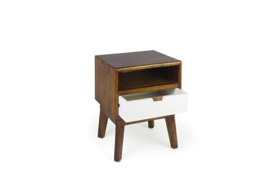 Crear cuentaMesilla noche 1 cajón colonial actual. Mesita de noche para el dormitorio estilo colonial con 1 cajón con estante, se fabrica en madera maciza de mindi acabado nogal avellana y blanco. Enlace toda la colección ARTICT