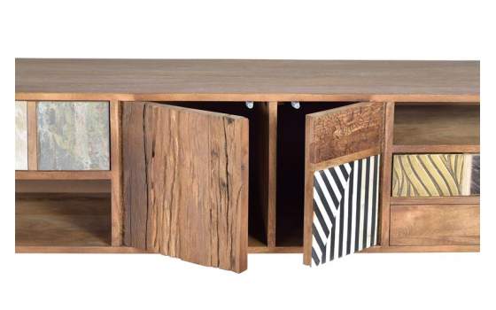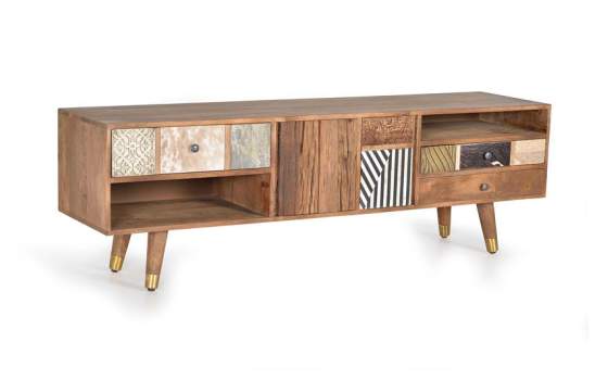 Mueble televisión salón diseño Moderno. Mueble bajo televisión 3 cajones y 2 puertas, se fabrica en madera maciza de mango con decoración en los frontales de detalles en bronce, cobre, piel de vacuno y hueso de camello, armazón color nogal claro. Enlace toda la colección Boazca